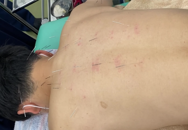 経絡治療の背中の「標治」の参考例です。数多くの鍼が浅く刺鍼されています。